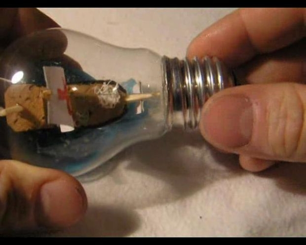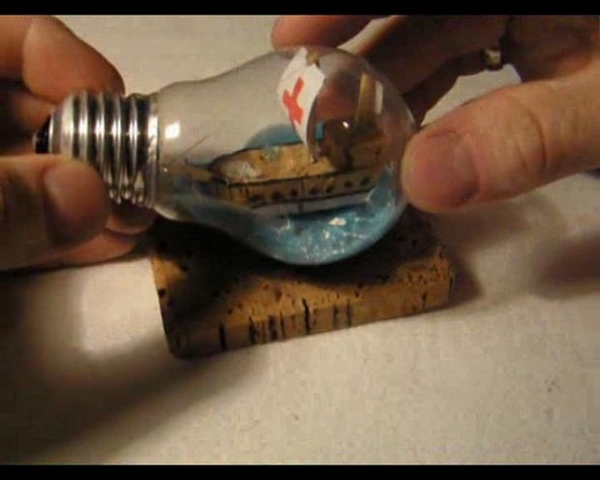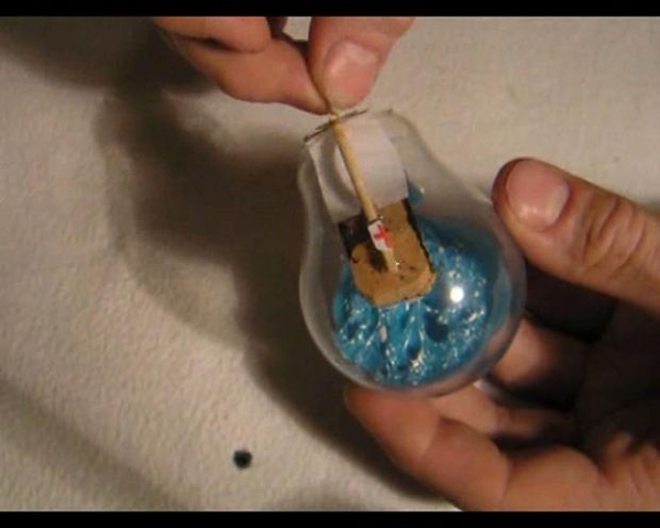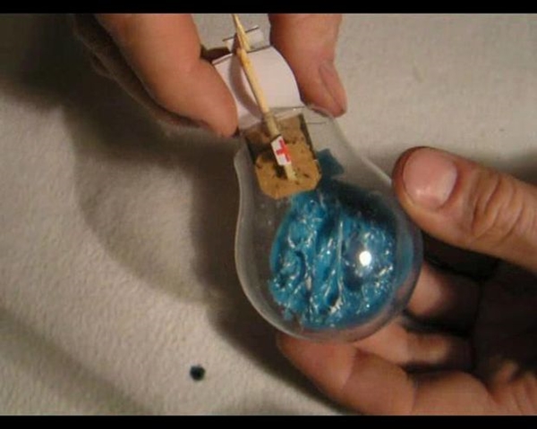 STEP 5 เมื่อน้ำทะเลแห้งแข็งเรียบร้อยแล้ว ก็ให้เอาเรือสำเภาลำจิ๋วของเราใส่ลงไปในหลอดไฟ