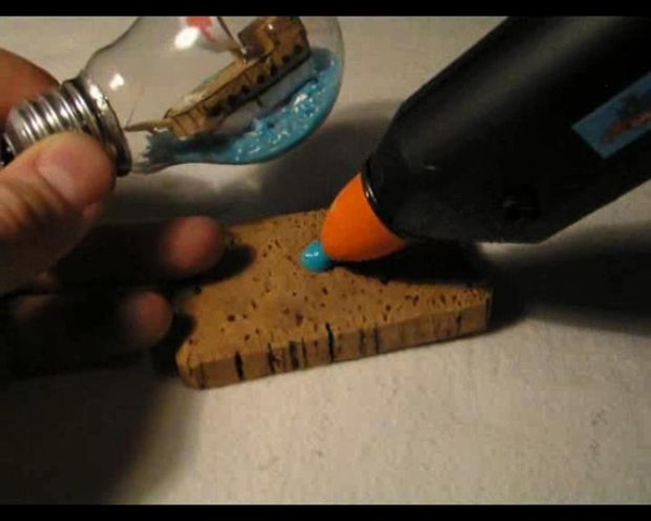 STEP 8 ตัดไม้ก๊อกให้เป็นแท่นสีเหลี่ยมธรรมดา จากนั้นติดกาวและนำเอาหลอดไฟมาติดลงไป เป็นอันเสร็จ พร้อมโชว์แล้วล่ะ