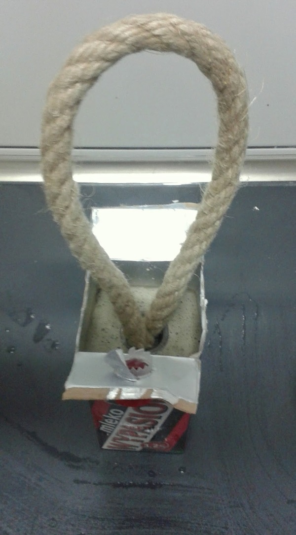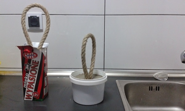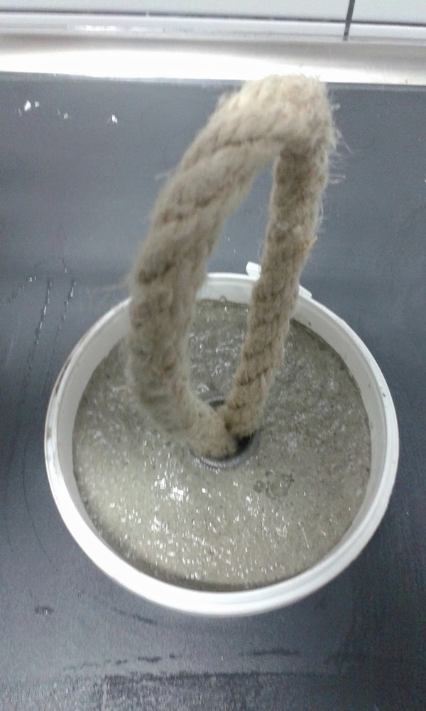 STEP 2 เทคอนกรีตลงในแม่พิมพ์ที่เตรียมเอาไว้ เขย่านิดๆ หน่อยๆ เพื่อกำจัดฟองอากาศด้านใน จากนั้นก็นำเอา Galvanized coupler ที่มีเชือกอยู่ด้านในมาจุ่มลงไปตรงกลางคอนกรีตด้านบน จับไว้สักพัก จนรู้สึกว่าอยู่ตัวแล้วจึงปล่อย