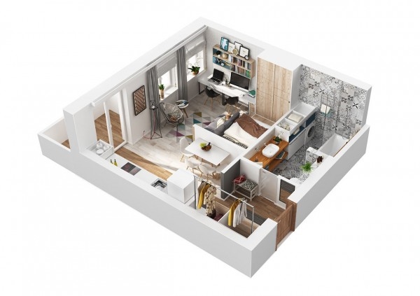 ห้องขนาด 40 ตร.ม. แห่งนี้ เป็นไอเดียตกแต่งของอพาร์ทเม้นท์แห่งหนึ่งใน Lviv ประเทศยูเครนกันค่ะ ตกแต่งภายในด้วยโทนสีขาวและเทา ร่วมกับเฟอร์นิเจอร์ไม้สีอ่อนๆ แม้จะไม่ได้มีขนาดใหญ่นัก แต่ก็ยังมีพื้นที่เพียงพอสำหรับการสังสรรค์ เวลามีเพื่อนฝูงหรือครอบครัวแวะมาหาที่ห้องอยู่บ้าง บรรยากาศสบายๆ มองเห็นได้ชัดเจนตั้งแต่เข้ามาในห้องกันเลยล่ะค่ะ มีการเล่นลายบริเวณกำแพงให้ออกมาดูมีสไตล์สวยๆ กันด้วย ภายในห้องตกแต่งในแบบง่ายๆ แบ่งเป็นสัดส่วนชัดเจน แต่ไม่ปิดทึบทั้งหมดให้ดูอึดอัด