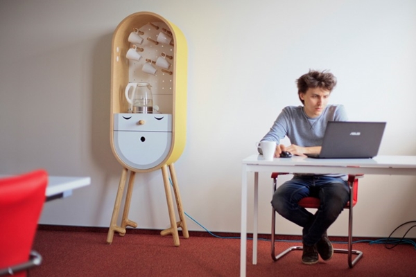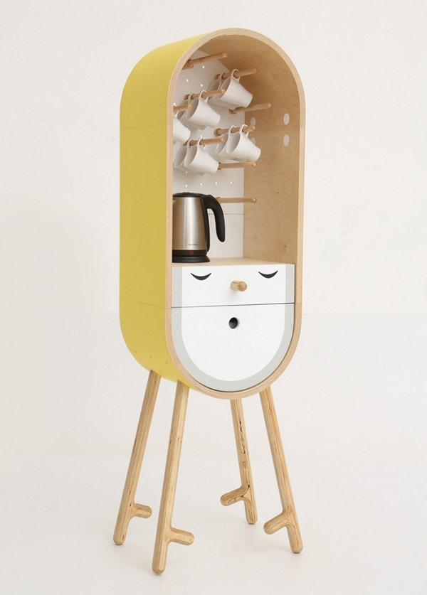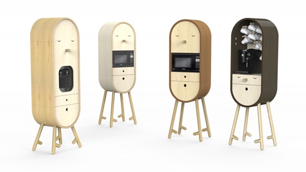 แบบแรกเป็นตู้สำหรับเก็บอุปกรณ์ในการชงกาแฟต่างๆ ด้วยรูปแบบตัวตู้ที่มีการทำไม้ยื่นออกมาสำหรับใช้แขวนถ้วยต่างๆ นอกจากนี้ตรงบริเวณชั้นวางก็ยังสามารถวางเครื่องทำกาแฟหรือกาน้ำร้อนได้ด้วย มีลิ้นชักให้สำหรับเก็บสิ่งของต่างๆ อาทิเช่น ช้อนส้อม ช้อนกาแฟ เป็นต้น