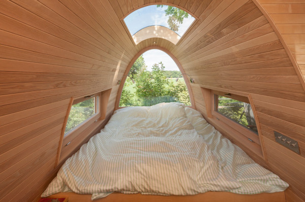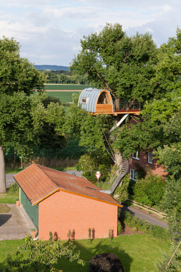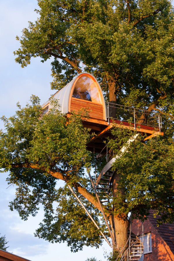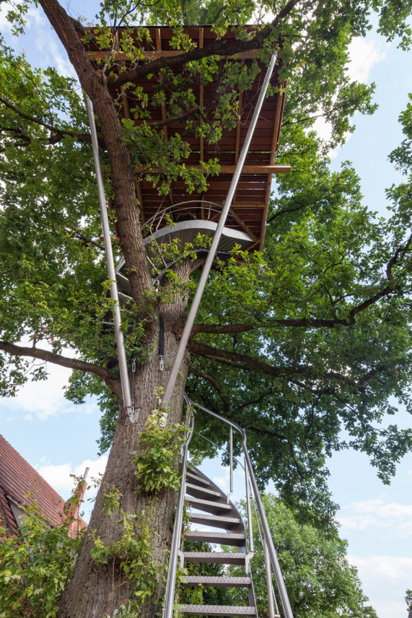 โดยผลงานการสร้างสรรค์ออกแบบบ้านต้นไม้หลังนี้ เป็นผลงานของสถาปนิก Andreas Wenning จากบริษัทออกแบบในเยอรมันอย่าง Baumraum ที่ดีไซน์บ้านต้นไม้ให้รับกับตัวต้นโอ๊คยักษ์สูงกว่า 11 เมตรได้อย่างเข้ากัน มีบันไดแสตนเลสเป็นบันไดวน พาคุณขึ้นสู่บ้านตันไม้สูงเสียดฟ้าหลังนี้ ส่วนบริเวณบ้านต้นไม้ด้านบนนั้นก็ตกแต่งให้มีพื้นที่เทอร์เรซไว้เป็นที่นั่งพักผ่อน ชมวิวเมืองสูงด้านบน ส่วนภายในนั้นก็ตกแต่งเป็นห้องนอนขนาดเล็กสำหรับพักผ่อน เปลี่ยนบรรยากาศไปในตัวนั่นเอง