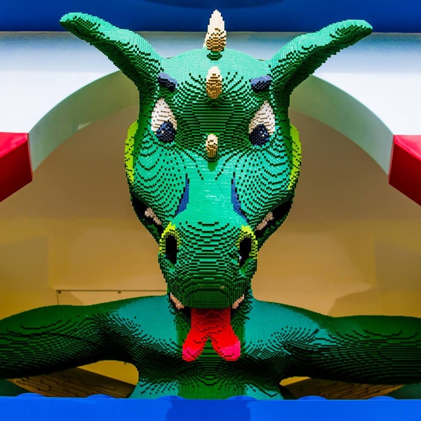 – มีมังกร LEGO สีเขียวต้อนรับอยู่ด้านบนทางเข้า