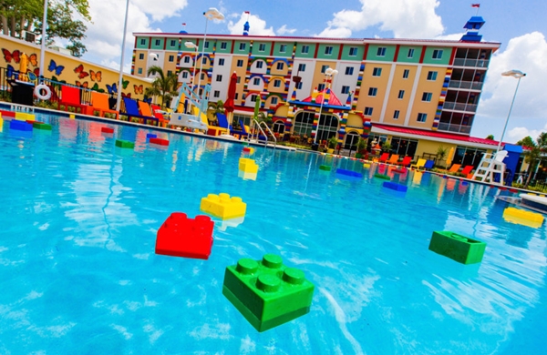 – สระว่ายน้ำขนาดใหญ่ของโรงแรมกับตัวต่อ LEGO ที่ลอยอยู่ให้เด็กๆ เกาะเล่นน้ำเพลินๆ
