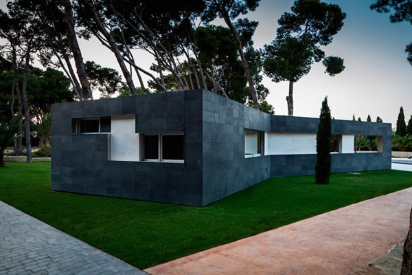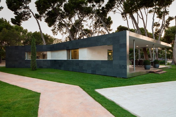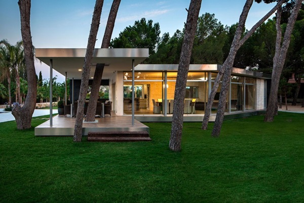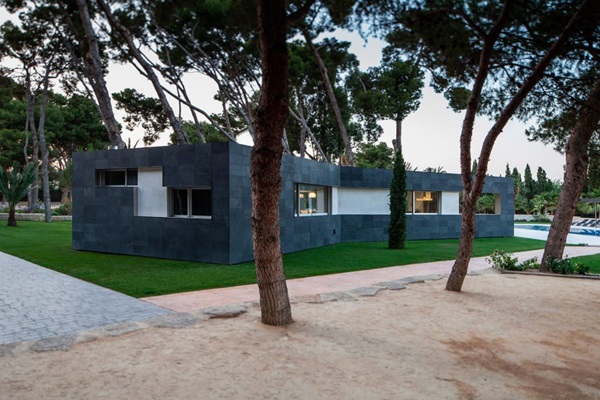 พามาชมแบบบ้านชั้นเดียว สไตล์โมเดิร์นสวยๆ ที่มีชื่อว่า Pine Forest Pavilion ตั้งอยู่ใน Alicante ประเทศสเปน ออกแบบตกแต่งโดย e2b arquitectos มีเนื้อที่ประมาณ 180 ตารางเมตร ซึ่งนับว่าใหญ่ทีเดียวเลยล่ะค่ะ บริเวณบ้านล้อมรอบไปด้วยต้นไม้สูงใหญ่ให้ร่มเงาและความร่มรื่น สนามหญ้าเขียวขจีกว้างใหญ่ มีสระว่ายน้ำฟรีฟอร์มขนาดใหญ่อยู่บริเวณหน้าตัวบ้าน