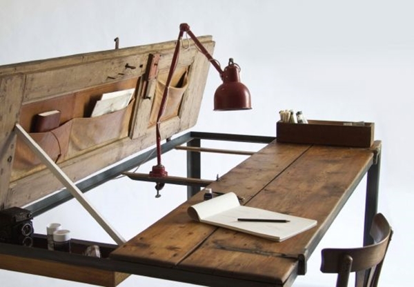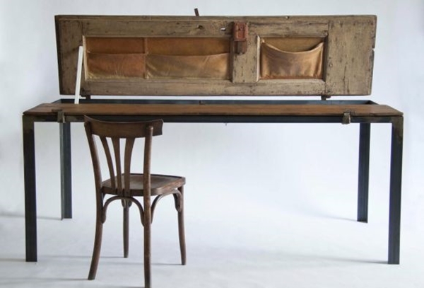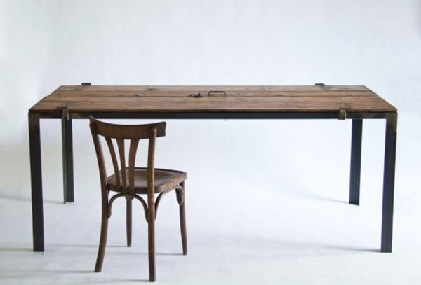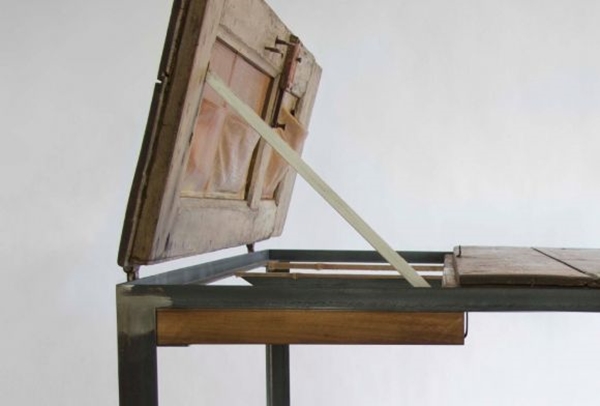 ตัวดีไซน์ของโต๊ะใช้ประตูที่เป็นแบบบานพับไม้ ทำให้สามารถเปิดบานประตูขึ้นลงได้ โครงโต๊ะเป็นเหล็กสีดำ ด้านบนตัวโต๊ะเป็นบานพับของประตู ด้านหนึ่งใช้สำหรับเป็นโต๊ะให้เขียนหนังสือหรือทำงาน อีกด้านหนึ่งของบานประตูเปิดขึ้นออกมาเป็นที่เก็บสิ่งของต่างๆ เพราะมีการทำช่องสำหรับเก็บของต่างๆ ติดเอาไว้ด้านในบานพับด้วย โคมไฟก็สามารถหนีบกับตัวโครงเหล็กฐานโต๊ะได้เช่นกัน เวลาจะใช้งานโต๊ะตัวนี้ ก็จัดการเปิดบานพับขึ้นมา ติดโคมไฟเอาไว้ เวลาจะเลิกใช้งาน คุณก็แค่พับบานประตูกลับไปปิดเหมือนเดิมก็เท่านั้น จะเปลี่ยนมาใช้เป็นโต๊ะรับประทานอาหารไปด้วยก็ได้ อันนี้ก็แล้วแต่ชอบเลยล่ะค่ะ