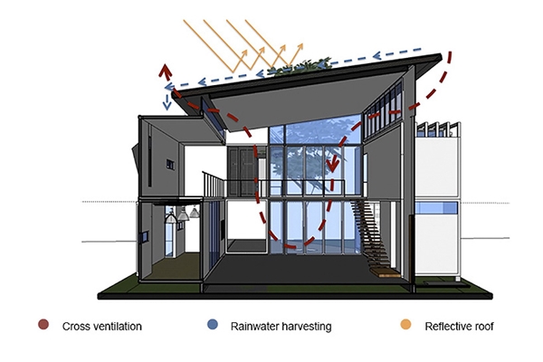 เนื่องจากภายในบ้านหลังนี้ มีเจ้าของบ้านเป็นช่างภาพ ภายในบ้านจึงถูกใช้เป็นทั้งพื้นที่พักผ่อนอยู่อาศัย และ พื้นที่ทำงาน บริเวณตัวบ้านจึงต้องโปร่งโล่ง เหมาะกับการถ่ายภาพ รับแสงสว่าง ซึ่งพื้นที่ภายในนั้นก็ตกแต่งในแบบที่สามารถยืดหยุ่นได้ สามารถปรับเปลี่ยนได้ตามความต้องการของเจ้าบ้าน ภายนอกดูโมเดิร์นด้วยตู้คอนเทนเนอร์สีเทาร่วมกับกระจกใส บางบริเวณก็มีแผงมู่ลี่จากไม้ไผ่ตกแต่งอยู่ กลมกลืนกับธรรมชาติ