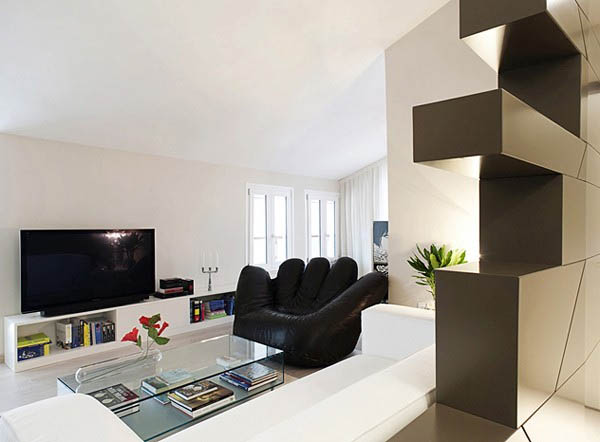 อพาร์ทเม้นท์สวยมีดีไซน์ห้องนี้ออกแบบโดยบริษัท Studiovo ตกแต่งในสไตล์ร่วมสมัยออกไปในแนวโมเดิร์น ภายในห้องมีการแสดงเส้น สาย และรูปแบบของฉากกั้นห้องที่เป็นแบบซิกแซก ตกแต่งด้วยโทนสีขาว ดำ ห้องนั่งเล่นโดดเด่นด้วยโซฟารูปทรงน่ารัก ส่วนห้องครัวและห้องนอนตกแต่งด้วยสีขาว ภายในแต่ละห้องก็ยังคงคอนเซ็ปต์การใช้เส้นสายเข้ามาร่วมตกแต่ง เพื่อให้ห้องทั้งหมดยังเป็นธีมเดียวกัน แม้กระทั้งกระจกในห้องนอน ก็จัดวางในรูปแบบซ้อนทับ สลับไปมา ไอเดียเก๋ น่าสนใจมากเลยทีเดียวคะ ว่าแล้วเรามาชมกัน