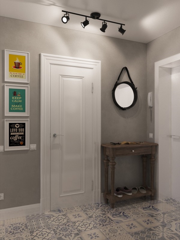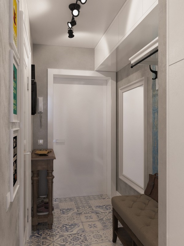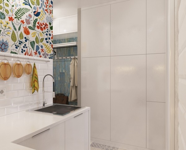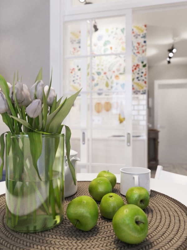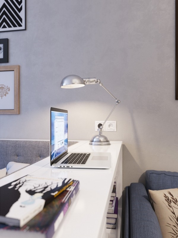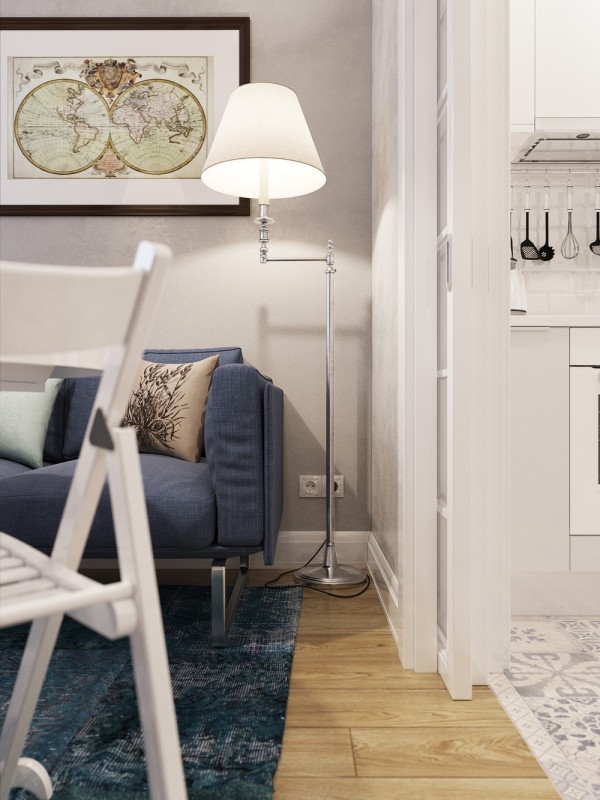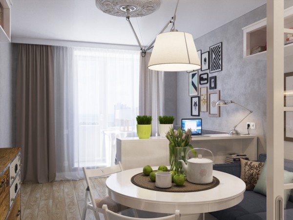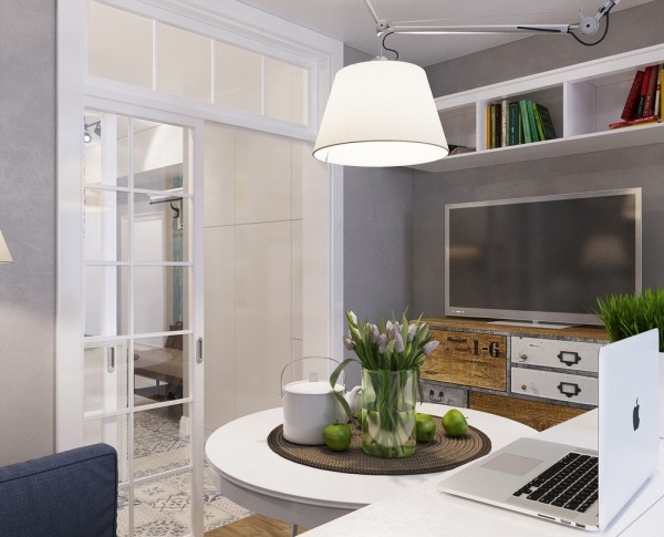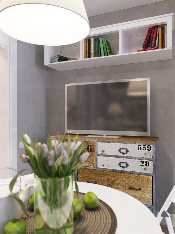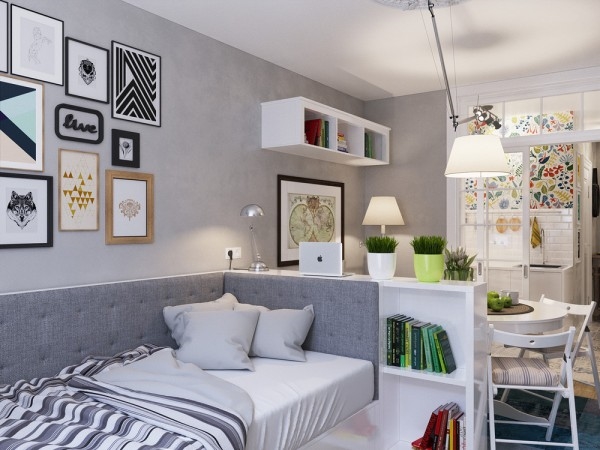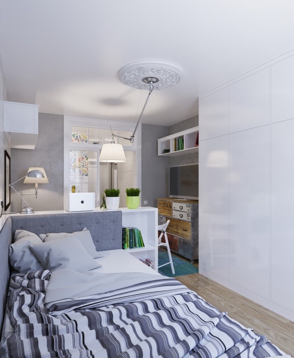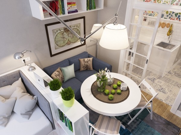 สำหรับไอเดียนี้ เป็นการตกแต่งห้องคอนโดสำหรับผู้อยู่อาศัยเพียงคนเดียว ดังนั้นขนาดพื้นที่คอนโดจึงไม่ค่อยมีพื้นที่ใช้สอยมากนัก ตกแต่งด้วยโทนสีขาวและเทา มีประตูบานเลื่อนกั้นระหว่างพื้นที่ห้องนั่งเล่นเล็กๆ กับส่วนของห้องครัว พื้นที่รับประทานอาหารก็ใช้พื้นที่เดียวกันกับบริเวณนั่งเล่น มีโต๊ะกินข้าวตั้งอยู่ด้านหน้าโซฟาสำหรับสองที่ ประหยัดพื้นที่ตู้วางหนังสือด้วยการติดตู้หนังสือไว้ที่บริเวณกำแพงเหนือโซฟานั่งเล่นขึ้นไป