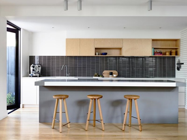 ส่วนบริเวณภายในบ้านนั้นตกแต่งในโทนสีขาว ดำ เทา เฟอร์นิเจอร์ดีไซน์ร่วมสมัยร่วมกับเฟอร์นิเจอร์ไม้สีอ่อนหลายชิ้น ซึ่งเป็นส่วนที่ทำให้ภาพรวมของบ้านนั้นดูอบอุ่น น่าอยู่ยิ่งขึ้นไปอีก ห้องนั่งเล่นกว้าง ติดกับประตูบานเลื่อนเปิดไปยังมุมพักผ่อนด้านนอกและสนามหญ้า สามารถเปิดบานประตูกระจกเลื่อนออกให้แสงสว่างส่องเข้ามาภายในตัวบ้านทั่วถึง หรือ เปิดรับลมเย็นๆ สบาย แทนการเปิดใช้เครื่องปรับอากาศ ช่วยลดโลกร้อนก็ได้ด้วยนะคะ มีโคมไฟดีไซน์เก๋แขวนประดับห้อยจากเพดานบริเวณโต๊ะรับประทานอาหาร กำแพงสาดสีฟ้าสดใส นอกจากนี้ห้องน้ำยังตกแต่งด้วยกระเบื้องหกเหลี่ยมสีขาว แม้จะแต่งแบบเรียบๆ แค่สีขาวกับไม้ แต่กลับดูแล้วสวย มีเสน่ห์อย่างบอกไม่ถูก ว่าแล้วก็ลองไปชมกันดูสิคะ ถ้าใครชอบไอเดียแต่งบ้านสไตล์นี้ล่ะก็ ลองมาชมภาพเพิ่มเติมกันค่ะ