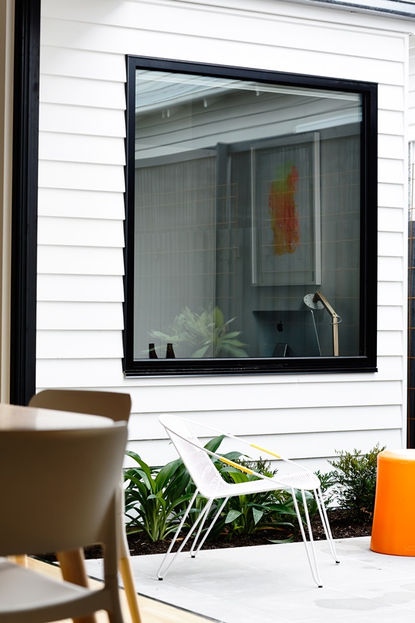 บริเวณตัวบ้านภายนอกด้านหนึ่งจะโดดเด่นด้วยโครงสร้างของบ้านที่มีสีดำและขาวตัดกัน มีมุมนั่งเล่นนอกบ้าน จัดเป็นมุมพักผ่อน นั่งสบายๆ ตกแต่งอยู่บนพื้นคอนกรีต มีสวนและสนามหญ้าเล็กๆ ด้านหน้า ต้นไม้สูงใหญ่ร่มรื่น บรรยากาศดีทีเดียวเลยค่ะ