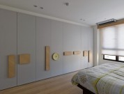 กำแพงอีกฝั่งก็ตกแต่งเป็นตู้เก็บเสื้อผ้า โต๊ะทำงานก็ซ่อนอยู่ในพื้นที่ตู้เสื้อผ้าอีกทีหนึ่ง ทำให้ห้องดูโปร่งสบายตา เวลาไม่ใช้งานก็เก็บไว้ด้านในตู้