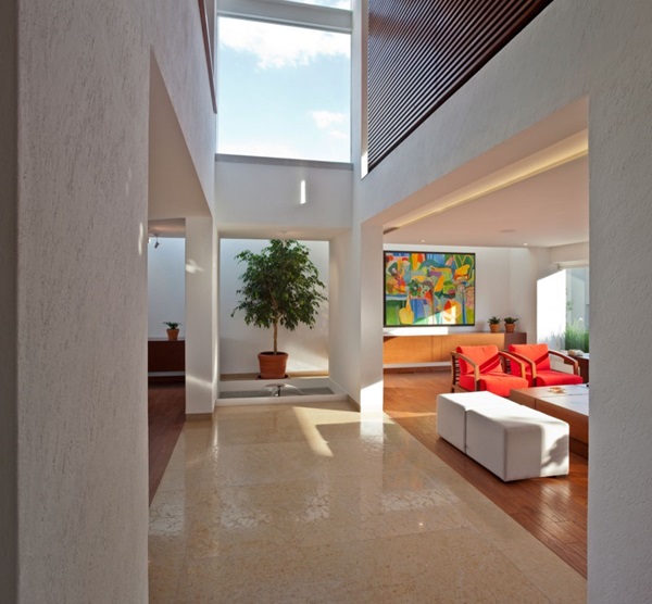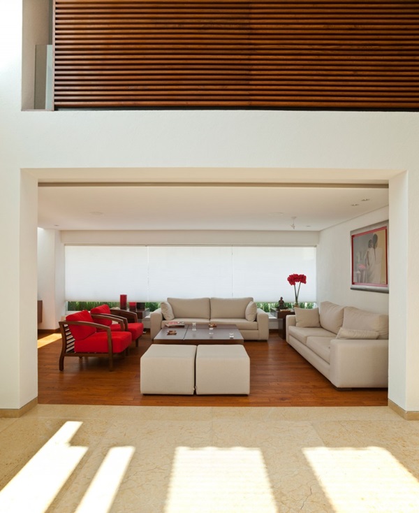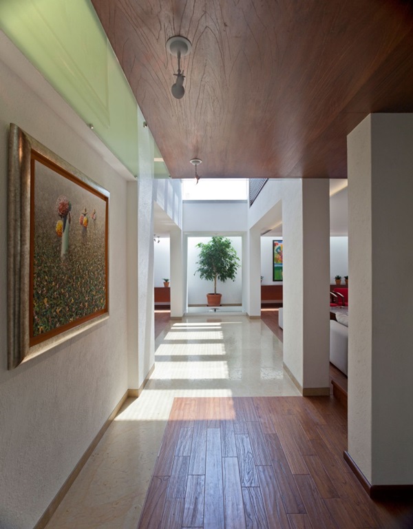 ภายในเพดานสูงโปร่ง ทำให้ดูกว้างขวางและสบายตา ไม่อึดอัด ตกแต่งด้วยโทนสีขาวเป็นหลัก ร่วมกับสีน้ำตาลของไม้ และสีสันอื่นๆ เฟอร์นิเจอร์ร่วมสมัย สิ่งอำนวยความสะดวกครบครัน ห้องนั่งเล่นกว้างใหญ่ ห้องรับประทานอาหารอยู่กลางบ้าน ห้องน้ำ ห้องครัว และห้องนอนกว้างขวาง การแต่งภายในด้วยวัสดุไม้ ช่วยทำให้บรรยากาศภายในบ้านหลังนี้นั้นดูอบอุ่น บริเวณทางเดิน กำแพง ก็ตกแต่งด้วยภาพศิลปะสีสันสดใส สวยงามทีเดียวเลยล่ะค่ะ ว่าแล้วเราก็ลองให้คุณได้ไปชมไอเดียตกแต่งบ้านหลังนี้กันดูดีกว่า หากคุณชอบ ก็ลองนำไปประยุกต์ใช้ตกแต่งกันดูนะคะ