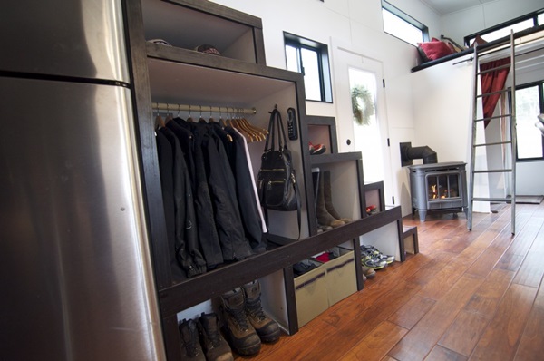 เนื่องจากรถบ้านนี้เป็นบล็อกสี่เหลี่ยม บริเวณมุมต่างๆ ของบ้านจึงถูกแบ่งสัดส่วนคล้ายๆ กับตัวต่อได้อย่างพอดี ภายในถูกแบ่งออกมาเป็นโซฟานั่งเล่นเล็กๆ ริมหน้าต่าง ถัดมาเป็นมุมโต๊ะทำงานหรือโต๊ะรับประทานอาหารแบบพับได้ ฝั่งตรงข้ามเป็นบันไดสำหรับขึ้นชั้นสอง บริเวณบันไดก็ดีไซน์ให้เป็นช่องเก็บของ เพิ่มพื้นที่จัดเก็บภายในบ้านเล็กๆ หลังนี้ได้เยอะขึ้นทีเดียว ตู้เสื้อผ้า ชั้นวางรองเท้า ที่แขวนกระเป๋าก็รวมอยู่บริเวณใต้บันไดเช่นกัน