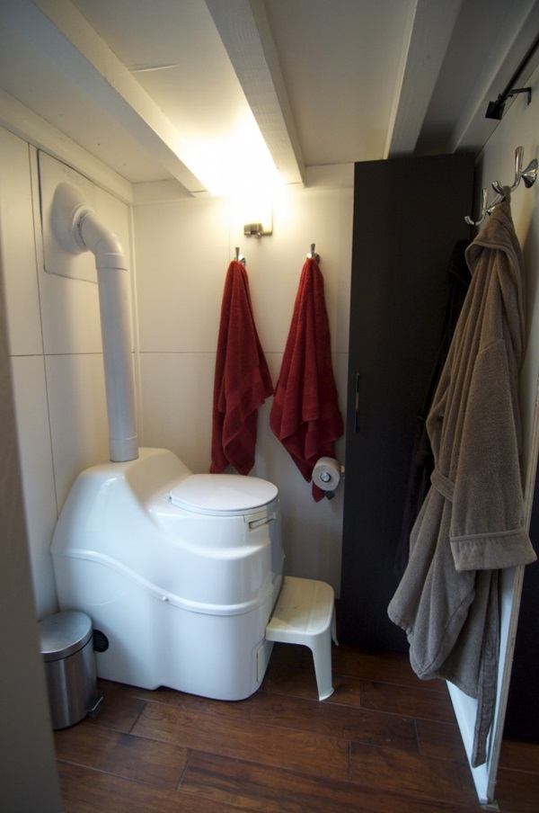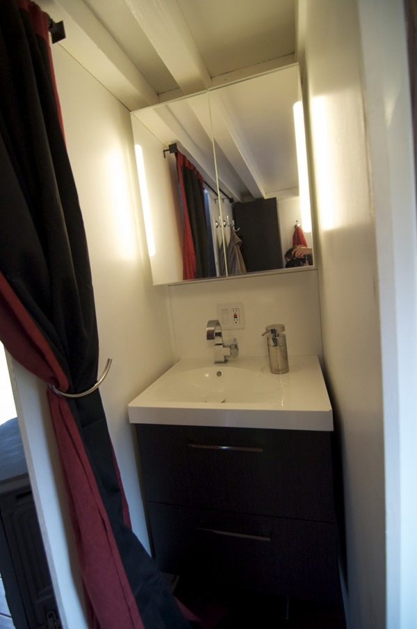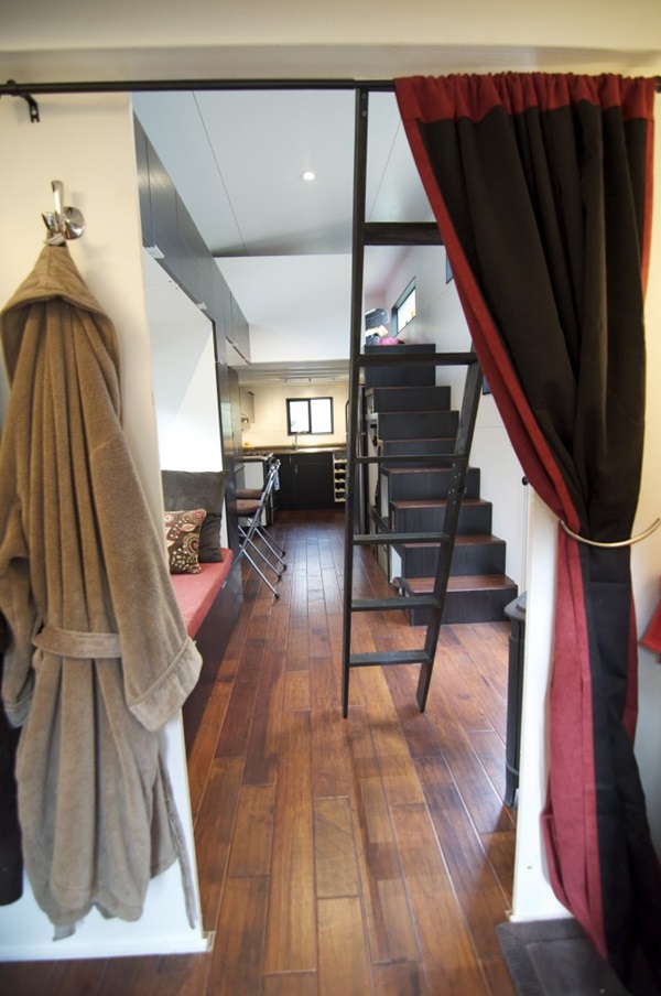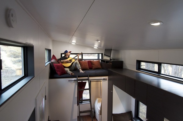 ห้องครัวอยู่มุมสุดของบ้าน ส่วนห้องน้ำก็อยู่อีกฝั่ง ส่วนบริเวณชั้นสองแบ่งออกมาเป็นมุมพักผ่อนและห้องนอน ซึ่งสามารถขึ้นมาที่บริเวณนี้ได้ด้วยบันไดกับบันไดลิงที่แขวนพาดอยู่ตรงกำแพง เห็นไอเดียนี้แล้วน่าอยู่ไม่เบาเลยนะคะว่ามั้ย เป็นการตกแต่งบ้านที่มีพื้นที่จำกัดได้ออกมาทันสมัยและดูน่าอยู่ไม่เบาเลย ใครที่บ้านมีขนาดเล็ก หรือ มีพื้นที่ห้องจำกัด อาศัยในคอนโด ชอบไอเดียตกแต่งรถพ่วงบ้านหลังนี้ ก็สามารถนำไปเป็นแบบไอเดียไว้ประยุกต์กันได้นะคะ