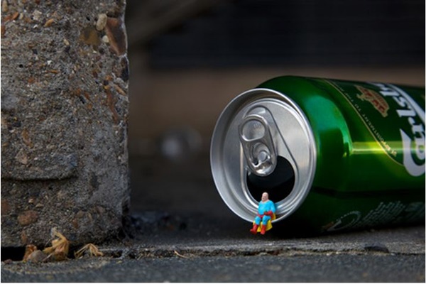 จะเกิดอะไรขึ้น เมื่อเศษขยะที่คนเราทิ้งเกลื่อนพื้น กลายมาเป็นฉากงานศิลปะสุดเจ๋งให้กับคนจิ๋ว ผลงานศิลปะที่สร้างสรรค์โดย Slinkachu ซึ่งเป็นศิลปินที่ครีเอทภาพถ่ายสร้างสรรค์โดยใช้คนจิ๋วเป็นองค์ประกอบหลักนั่นเองค่ะ โดยวันนี้เราก็ได้คัดเฉพาะไอเดียน่าทึ่งที่ใช้เศษขยะมาเป็นฉากให้กับเหล่าคนจิ๋วมาฝากให้ได้ชมกัน บอกเลย…ทันทีที่เราเห็นก็อดทึ่งไม่ได้ ซึ่งเชื่อว่าหลายๆ คน เมื่อได้ลองชมบทความนี้กันจนจบ ก็คงรู้สึกไม่ต่างกับเราเท่าไหร่นัก เศษขยะที่หลายคนมักง่าย ทิ้งพื้นถนนโดยไม่คำนึงว่าจะทำให้บ้านเมืองสกปรก รก ซะแค่ไหน และเมื่อตกเกลื่อนพื้นก็จะกลายเป็นสิ่งของที่สกปรกในสายตาใครหลายๆ คนไปโดยปริยาย แต่กลับสามารถใช้ความคิดสร้างสรรค์มาทำเป็นงานศิลปะภาพถ่ายสวยๆ ให้เราได้ชมกันได้อย่างนี้ เจ๋งจริงๆ เลยล่ะค่ะ
