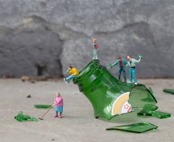 ดูอย่างภาพที่เศษขวดแก้วสีเขียวแตกเกลื่อนพื้นด้านล่างนี้สิคะ มีคนจิ๋วหลายยืนอยู่แถวนั้น มีคนจิ๋วกวาดเศษขยะเล็กๆ ที่เกลื่อนออกมาบนพื้นต่ออีกทอดหนึ่ง เห็นแล้วก็ทำให้เราคิดได้ว่าภาพนี้อาจจะต้องการแฝงแง่คิดให้เรารักษาความสะอาดกันมาด้วยก็ได้นะไม่แน่ ทั้งนี้ทั้งนั้นนี่เป็นเพียงความคิดเห็นส่วนตัวของเรา ใครชมภาพต่างๆ เหล่านี้แล้วคิดเห็นอย่างไรกันบ้าง ก็มาแชร์กันนะคะ ส่วนใครที่อยากจะชมภาพไอเดียคนจิ๋วเต็มๆ ทั้งหมดทุกเรื่องราว ก็สามารถชมผลงานของ Slinkachu เพิ่มเติมได้ ที่นี่ เลยค่ะ