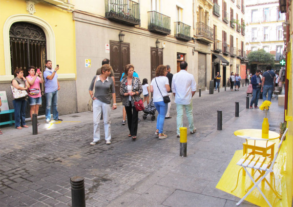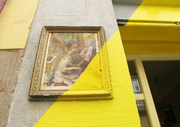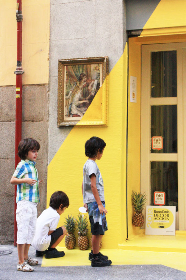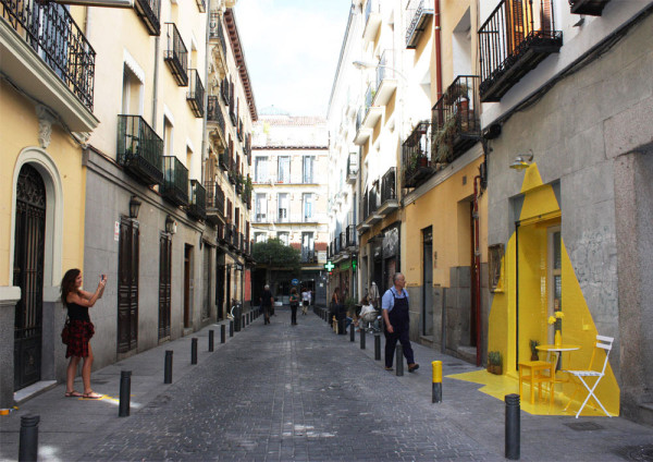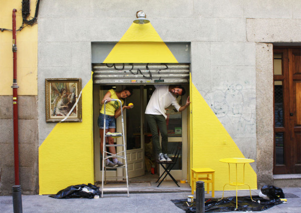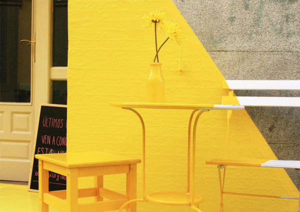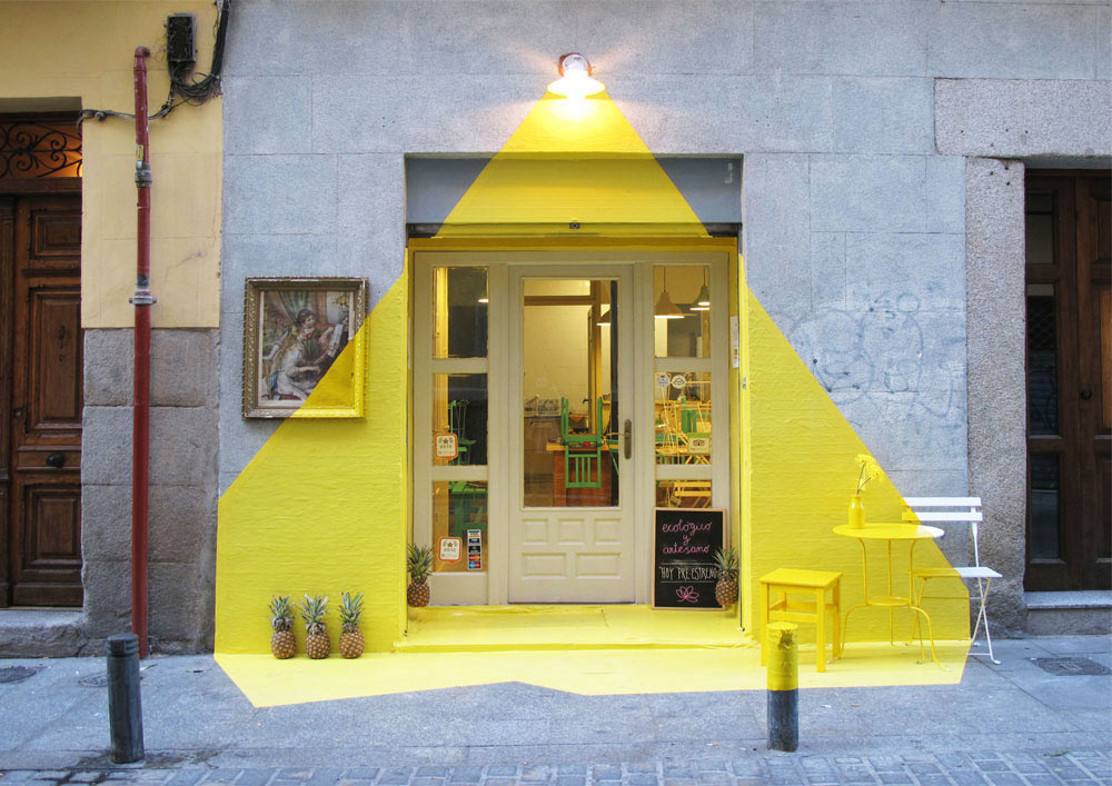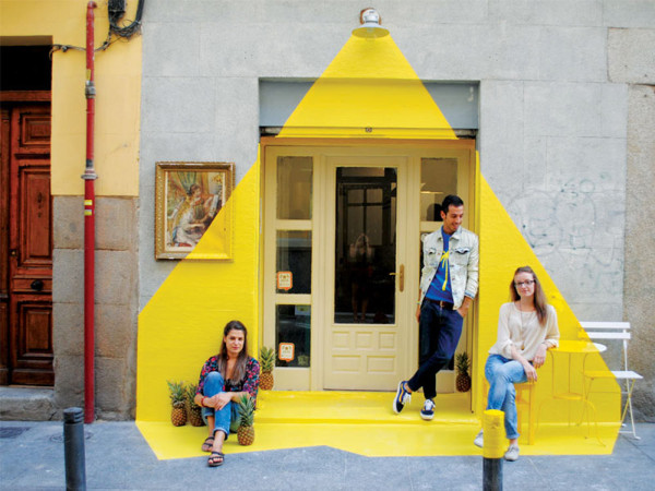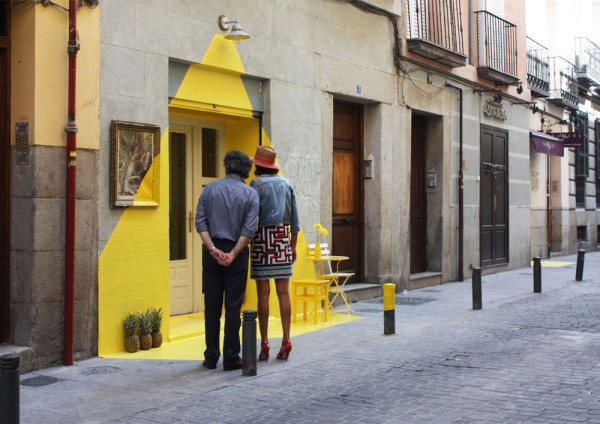 วันนี้มีไอเดียตกแต่งร้านอาหารสวยๆ โดดเด่นอย่างสร้างสรรค์มาฝากให้ได้ชมกันค่ะ เป็นการตกแต่งร้านอาหาร Rayen ที่ Lope de Vega street ในมาดริดให้น่าสนใจและดึงดูดสายตาผู้ที่ผ่านไปผ่านมา โดยได้รับการออกแบบจากทีมออกแบบ fos ซึ่งเป็นชื่อทีมออกแบบที่ใช้ชั่วคราว ตกแต่งออกแบบหน้าร้านอาหารให้ด้วยสก็อตเทปสีเหลืองสดใส ติดเทปให้เป็นรูปสามเหลี่ยมบนบริเวณผนังกำแพงอาคารที่เป็นสีเทาจากซีเมนต์ ตัดสีสันกันได้อย่างลงตัวอย่างสร้างสรรค์ และยังแมทกับหลอดไฟหน้าร้านให้เสมือนกับว่าฉายแสงลงมาเป็นพื้นที่สามเหลี่ยมนี้อีกด้วยล่ะค่ะ