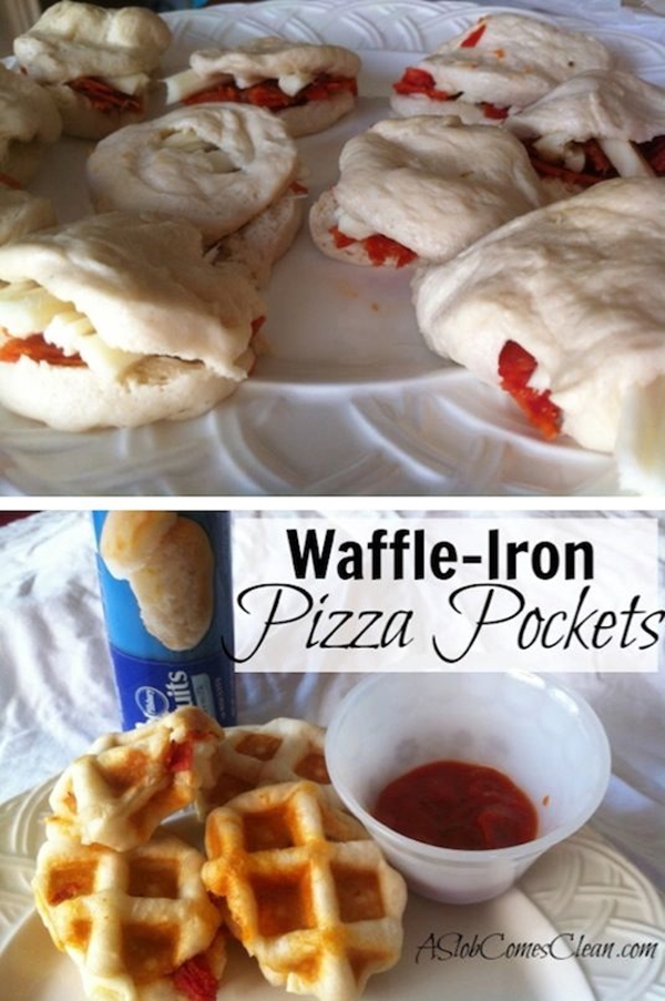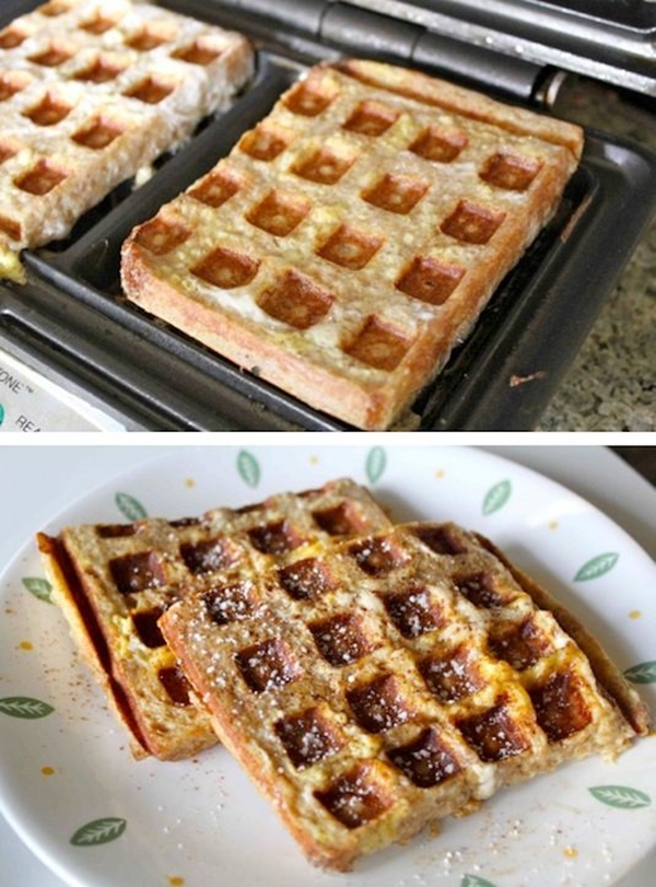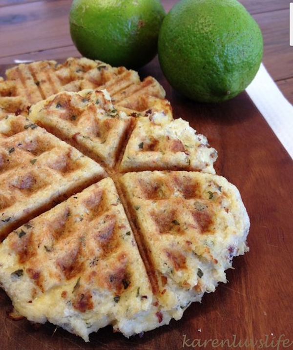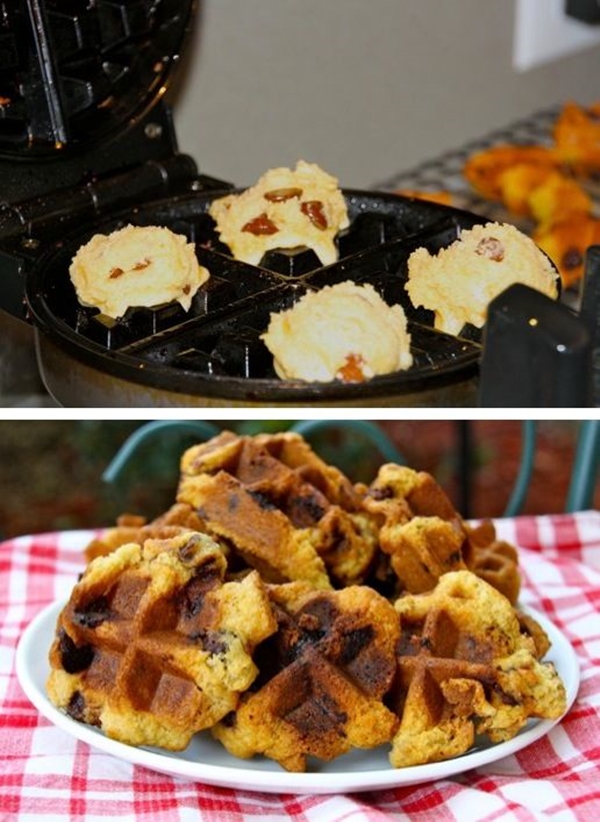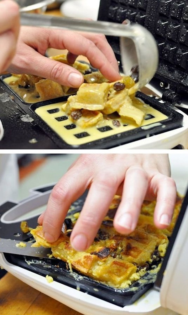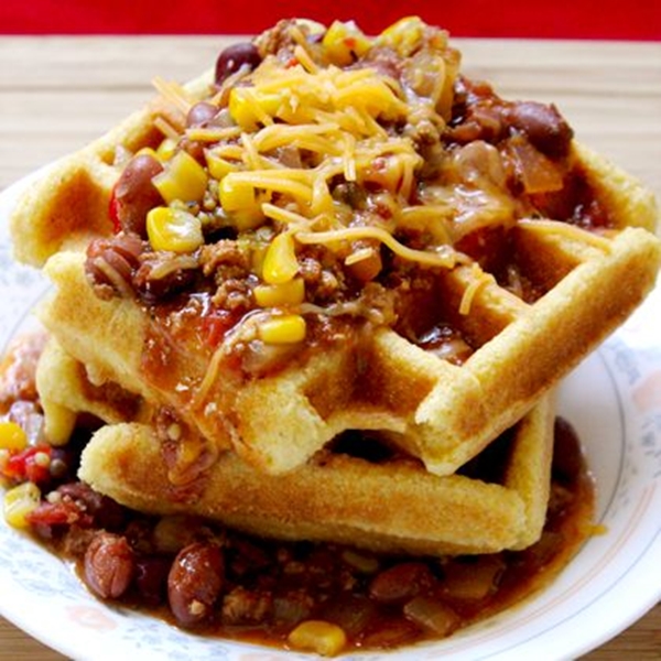 ไอเดียที่ 20 ขนมปังราดข้าวโพดและซอสพริก ดูจะเป็นเรื่องไม่น่ากิน แต่พอใช้เครื่องวาฟเฟิลทำ กลับดูน่ารับประทาน