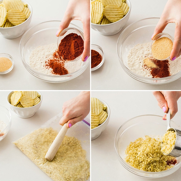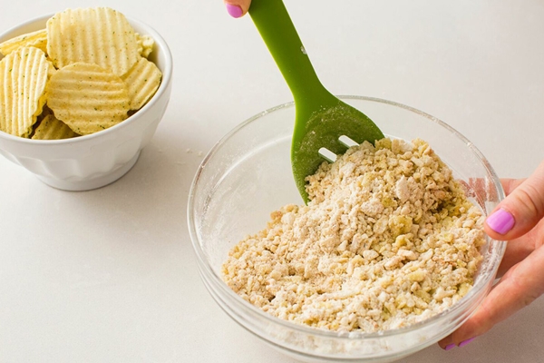 STEP 2 นำเอาแป้งอเนกประสงค์ พริกป่น ผงกระเทียม ใส่ในชามผสม จากนั้นนำเอามันฝรั่งทอดกรอบที่เตรียมไว้ ใส่ลงในถุงซิบ ทุบให้แตกละเอียด แล้วนำมาใส่ลงในชามผสม จากนั้นก็มิกซ์ส่วนผสมทั้งหมดให้เข้ากัน