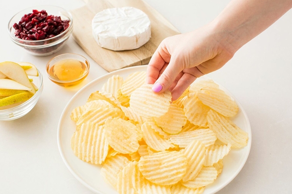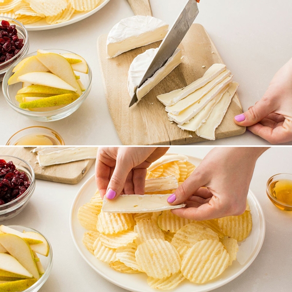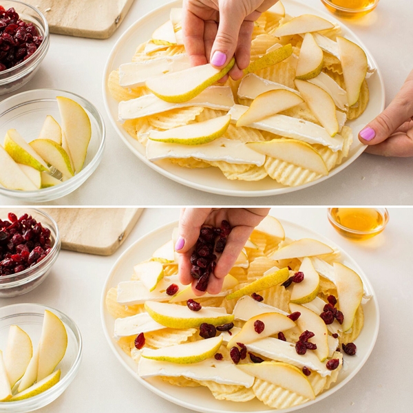 STEP 1 เปิดเตาอบทิ้งไว้ที่อุณหภูมิ 400 องศาฟาเรนไฮต์ จากนั้นนำเอามันฝรั่งทอดกรอบจัดวางไว้ที่จาน วางเนยแข็งที่หั่นบางๆ และลูกแพรที่หั่นบางๆ ไว้แล้วด้านบน โรยด้วยแครนเบอร์รี่อบแห้ง