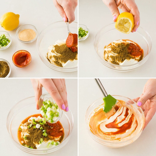 STEP 1 นำเอามายองเนส ผงกระเทียม Sour Cream ยี่หร่า ซอสศรีราชา น้ำมะนาว และหัวหอม ใส่ลงในชามผสม จากนั้นคลุกให้เข้ากัน แล้วนำไปแช่เย็นทิ้งไว้ 30 นาที