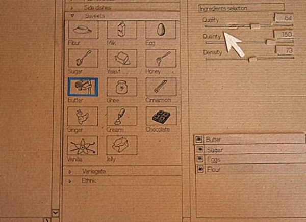 สำหรับวิดีโอนี้ เป็นการจำลองเอาวิธีการทำคุกกี้เนยน่าทานมานำเสนอให้น่าสนใจด้วยการเล่นกับเมนูต่างๆ ในโปรแกรมตกแต่งภาพชื่อดังอย่าง Adobe Photoshop ในรูปแบบของโปรแกรมที่ทำมาจากกระดาษกล่องสีน้ำตาล มีเมนูต่างๆ เป็นเครื่องไม้เครื่องมือในการทำขนม ทั้งไม้ตีไข่ ที่นวดแป้ง มีทั้งเลือกจาน ถาด สำหรับทำคุกกี้ ตัดแป้งทิ้ง เติม Topping โรยหน้าแบบต่างๆ นำเข้าอบคุกกี้ และอื่นๆ ซึ่งเห็นแล้วเพลิดเพลินได้ดีจริงๆ เลยล่ะค่ะ ไม่แปลกใจเลยว่าทำไมใครๆ เห็นแล้วถึงได้อมยิ้มไปกับความน่ารักนี้ เห็นแล้วเชื่อเลยว่าหลายๆ คนคงอยากทำคุกกี้ขึ้นมาทันใด ก็แหม…วิดีโอนี้มันน่ารักจริงๆ นี่น่า ซึ่งเราก็เก็บภาพช็อตต่อช็อตมาฝากกันด้วยคะ ลองไปชมความน่ารักวิดีโอนี้กันดู