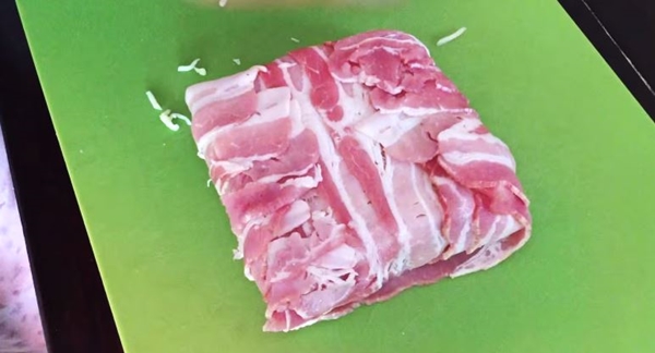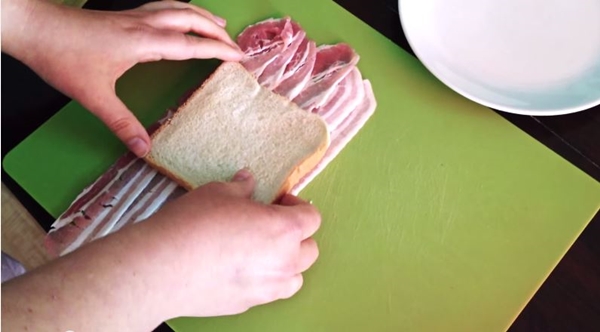 STEP 1 นำเอาเบคอนมาวางเรียง ซ้อนกันให้มีความกว้างเท่ากับขนมปัง จากนั้นนำเอาขนมปังมาวางลงไปด้านบนเบคอน