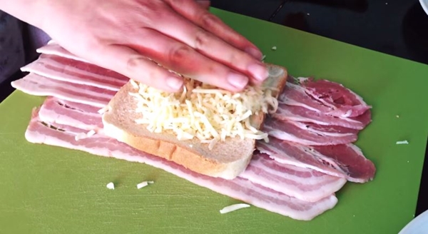 STEP 4 เอาปลายเบคอนห่อขึ้นมาไว้ด้านบนขนมปังทั้งสองฝั่ง จากนั้นกลับด้านขนมปังขึ้นมา
