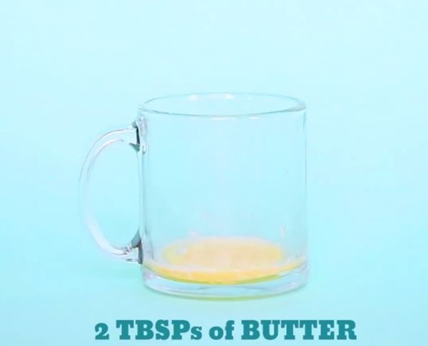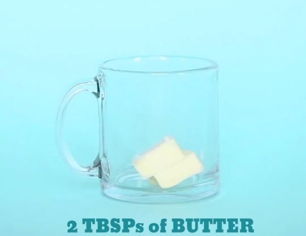 STEP 1 นำเอาเนย 2 ช้อนโต๊ะ ใส่ถ้วยกาแฟ แล้วนำเข้าอุ่นในไมโครเวฟ ระยะเวลาเพียงเล็กน้อย พอให้เนยละลาย