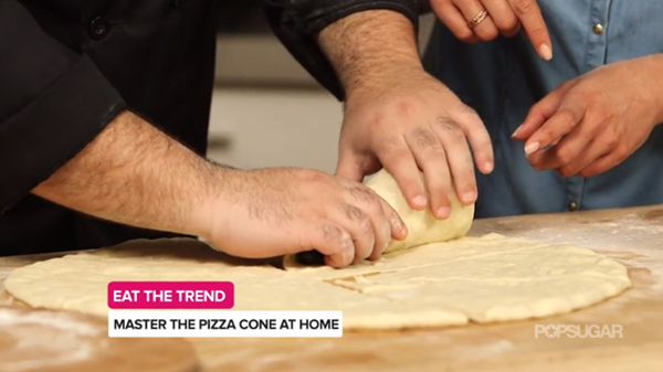 STEP4 จากนั้นเอากรวยที่เตรียมไว้ ทาด้วยน้ำมันมะกอก แล้วนำเป็นต้นแบบให้กับแป้งที่แบ่งแล้วแต่ละส่วน พันแป้งรอบกรวย จะได้ออกมาเป็นแป้งพิซซ่ารูปโคนเตรียมไว้สำหรับใส่หน้าพิซซ่าต่างๆ