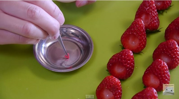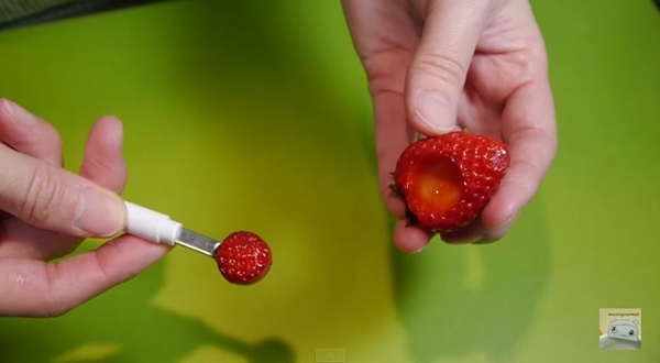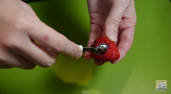 STEP 10 จากนั้นใช้ที่ตักผลไม้ ตักลงไปให้เนื้อสตรอเบอร์รี่หายเป็นวงกลม ทำซ้ำเช่นนี้ในสตรอเบอร์รี่แต่ละลูก จนกระทั่งครบจำนวนที่ต้องการ