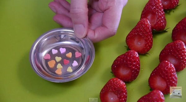 STEP 12 เอาแคนดี้ตกแต่งรูปหัวใจแยกสีที่ต้องการใช้ ซึ่งส่วนนี้เราจะใช้ทำเป็นปากของ Strawberry Man กันค่ะ ลองเลือกสีโทนเหลือง ส้ม ชมพู แดง ที่เหมาะกับการทำเป็นสีปากกันนะคะ