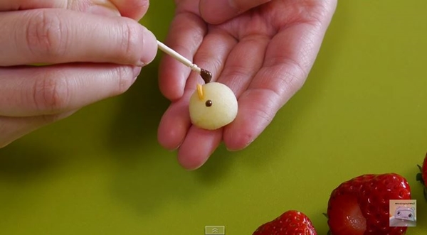 STEP 14 เอาไม้จิ้มฟันจุ่มช็อกโกแลต จากนั้นเอามาแต้มลงไปเป็นจุดเล็กๆ ทำเป็นตาลงบนลูกแอปเปิ้ล