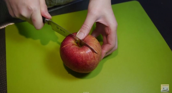 STEP 2 นำเอาแอปเปิ้ลที่เตรียมไว้ออกมาหั่นแบ่งครึ่งลูก