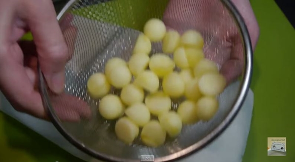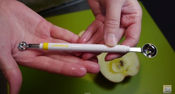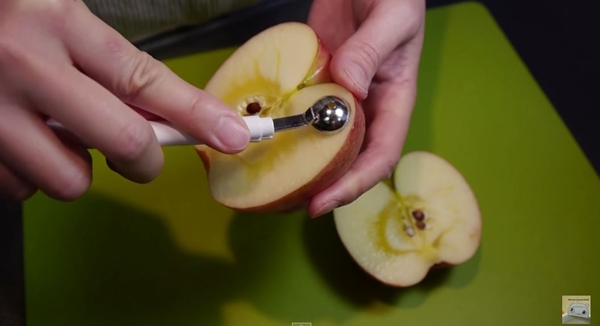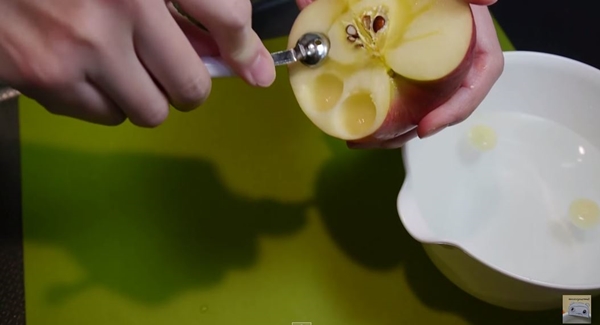 STEP 3 นำเอาที่ตักผลไม้เป็นลูกกลมๆ มาตักเนื้อแอปเปิ้ลให้กลายเป็นลูกกลมๆ