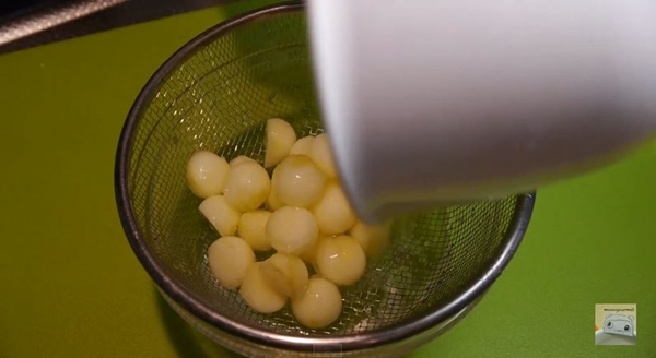 STEP 6 หาชามเปล่ามา 1 ชามพร้อมด้วยตะแกรงใช้สำหรับเทน้ำเกลือที่มีลูกแอปเปิ้ลแช่อยู่ออก