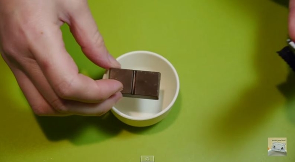STEP 8 นำเอาช็อกโกแลตแกะออกมาใส่ถ้วยแล้วนำเข้าไมโครเวฟ ละลายช็อกโกแลต