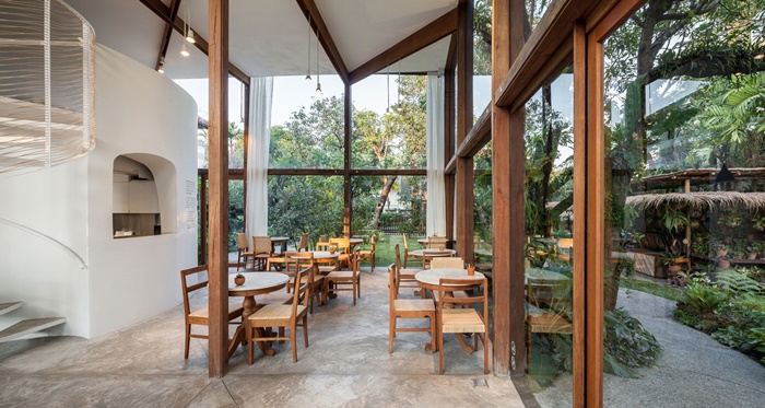 โครงสร้างของตัวร้านใช้ไม้เก่าจากแพสวนสามพราน เพดานถูกยกสูง ล้อมรอบด้วยกระจกใส ที่ดูโปร่ง ให้ความรู้สึกอบอุ่นด้วยแสงธรรมชาติจากด้านนอกที่ส่องเข้ามา ที่สำคัญยังสบายตา เพราะมองเห็นวิวสวนที่โอบล้อมอยู่โดยรอบร้านอีกด้วย
