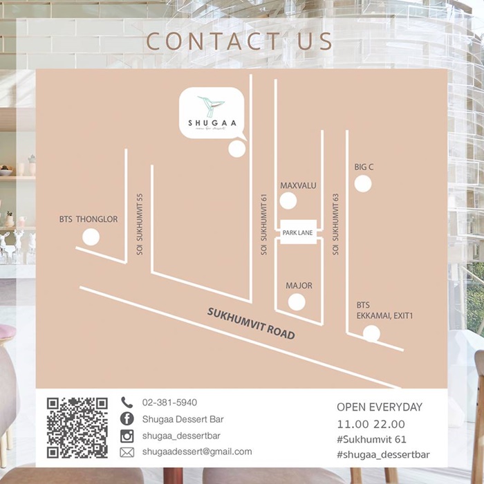 ร้านขนมหวาน บรรยากาศดีๆ มีอยู่หลายแห่ง แต่หนึ่งในนั้นที่ Jeab.com เห็นแล้วอยากจะชวนทุกคนให้ได้ไป คือ ร้าน SHUGAA room for dessert ร้านขนมหวานน่ารักๆ ที่สุขุมวิท 61 กันค่ะ ร้านนี้ไม่เพียงแต่มาพร้อมชื่อที่พ้องเสียงกับคำว่า Sugar ที่แปลว่าน้ำตาลแล้ว การตกแต่งภายในร้านยังหวานสมชื่ออีกด้วยล่ะ เห็นแล้วทำเราเอาอยากอยู่ภายในร้านทั้งวัน ไม่เชื่อลองตามเรามาชมบรรยากาศของร้านกันดูค่ะ