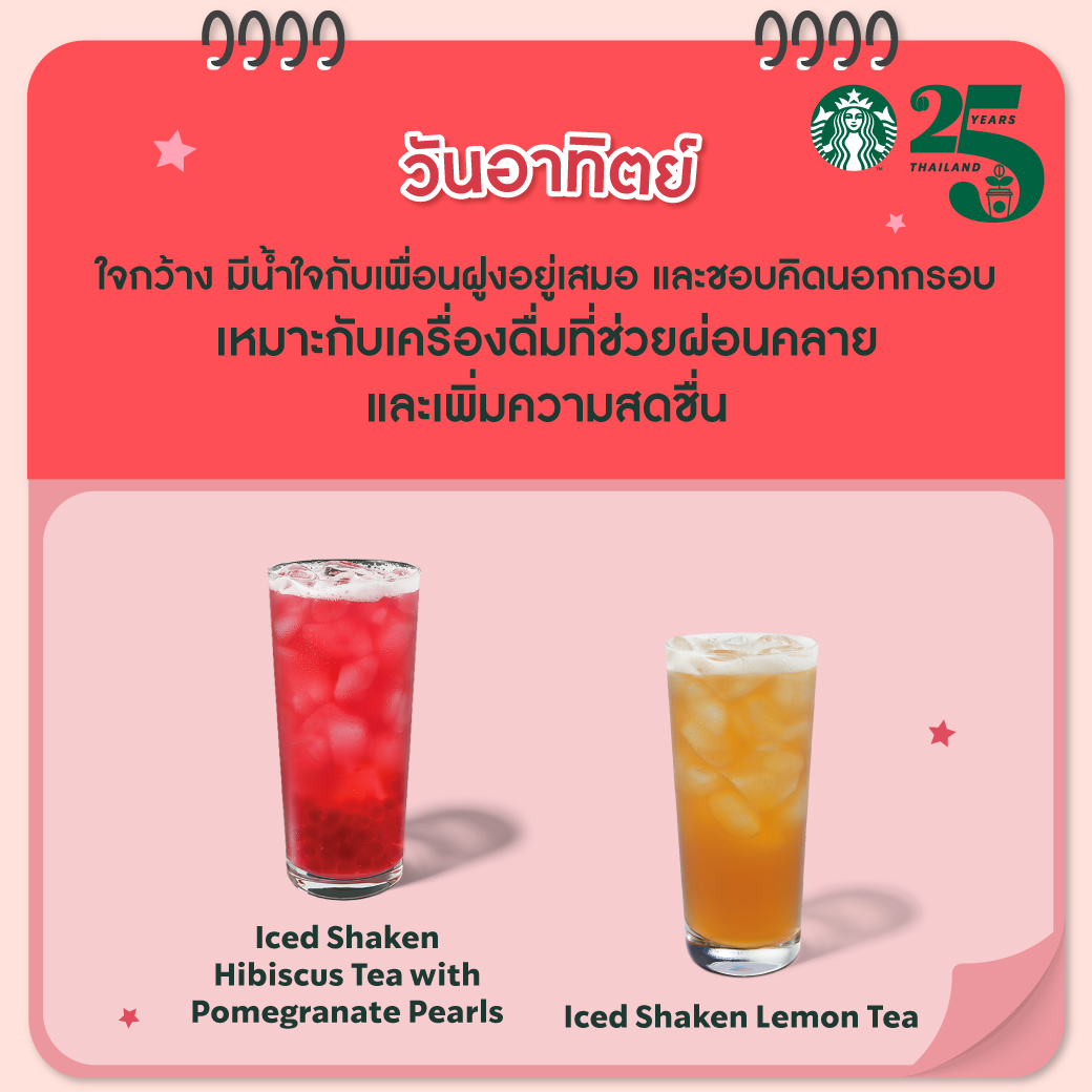 ปีใหม่ทั้งทีก็ต้องเพิ่มความแฮปปี้ต้อนรับปีใหม่ สตาร์บัคส์จึงได้คัดสรรเครื่องดื่มประจำวันเกิดมาให้ลูกค้าได้เลือกสดชื่นตามวันเกิดกับแคมเปญ #StarbucksHappy7Days ที่มาพร้อมเครื่องดื่มหลากรสชาติ เหมาะกับผู้ที่เกิดในแต่ละวันดังนี้