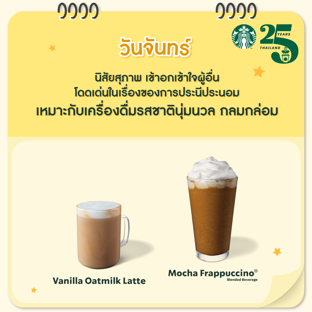 คนเกิดวันจันทร์มีอุปนิสัยเป็นคนอ่อนไหว สุภาพ ขี้เกรงใจ และเข้าสังคมได้ดี มีความเข้าอกเข้าใจผู้อื่น อีกทั้งยังเป็นคนมองโลกในแง่ดี นอกจากนี้ ยังเป็นคนโดดเด่นในเรื่องของการประนีประนอม จึงเหมาะกับเครื่องดื่มอย่าง วานิลลา โอ๊ตมิลค์ ลาเต้ (Vanilla Oatmilk Latte) กาแฟผสมนมโอ๊ตมิลค์สุดคลาสสิค ที่เข้ากันอย่างลงตัว กับน้ำเชื่อมวานิลลารสชาตินุ่มลิ้น และ มอคค่า แฟรบปูชิโน่ (Mocha Frappuccino® Blended Beverage) กาแฟปั่นรสชาติเข้มข้นท็อปด้วยวิปครีมรสละมุน ที่ดื่มแล้วช่วยเพิ่มพลังงานเติมความสดชื่น ไม่ว่าจะเป็นเวลาไหนก็จะเพิ่มความสดใส เป็นพลังงานบวกให้คนวันจันทร์ได้ตลอดทั้งวัน