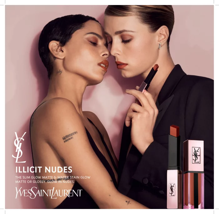 อีดี้ แคมป์เบล และ โซอี้ แครวิตซ์ สองทูตความงามประจำหมวดผลิตภัณฑ์แต่งหน้าของ อีฟส์ แซ็งต์ โลร็องต์ โบเต้ ขยับเข้าใกล้กัน เพื่อการสวมกอดต้องห้ามที่เปี่ยมไปด้วยความเร่าร้อน ในภาพโฆษณาซึ่งถ่ายโดย เดวิด ซิมส์ (David Sims) ช่างภาพชื่อดังระดับโลก อีดี้สวมทักซิโด้สีดำ ผมหวีปาดเรียบแนบไปกับรูปศีรษะ มือซ้ายคีบ Rouge Pur Couture The Slim Glow Matte ไว้ด้วยท่าทางสุดเท่ โซอี้สวมเสื้อสายสปาเก็ตตี้สีดำคอกว้าง อิงแอบแนบชิด เผยอริมฝีปากที่แต่งแต้มด้วยลิปสเตนเงาวาว ลิปของทั้งคู่ ดูสวยกลืนไปกลับผิวหน้าที่เปล่งปลั่งอย่างไร้รอยต่อ และเข้ากับแอดติจูดของพวกเธอได้อย่างเหมาะเจาะ โซอี้ดูเย้ายวนด้วยริมฝีปากแวววาวหยาดเยิ้ม ขณะที่อีดี้เจิดจรัสด้วยเรียวปากสีแม็ตต์ในแบบนู้ด