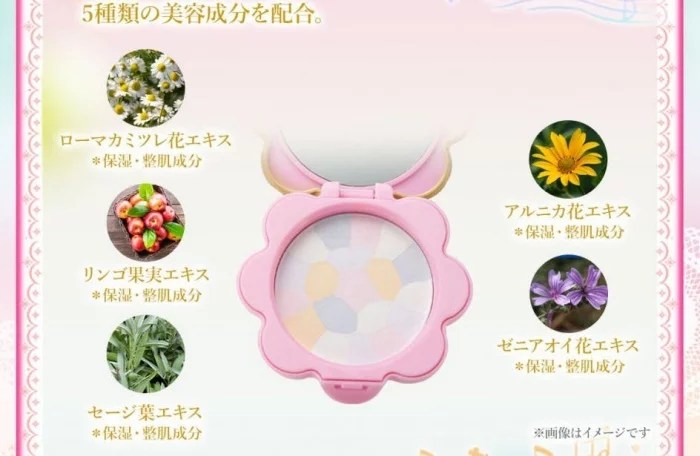 แป้งอัดแข็งไร้สีโดยใน 1 ตลับมีสีสันสดใสตามสีของเหล่าแม่มดน้องทั้ง 5 โดยเนื้อแป้งจะถูกปรับเข้ากับสีผิวของเพื่อนๆ ในแป้งนี้มีความพิเศษตรงที่เข้าได้ผสมส่วนผสมจากธรรมชาติไว้มากมาย ความพิเศษของแป้งตลับนี้คือ เขาออกมาเพื่อให้แฟนคลับเหล่าแม่มดโดเรมีโดยเฉพาะ เพราะตัวตลับแป้งมีแรงบันดาลใจมาจากตลับแปลงร่างของเหล่าแม่มดน้อยฯ