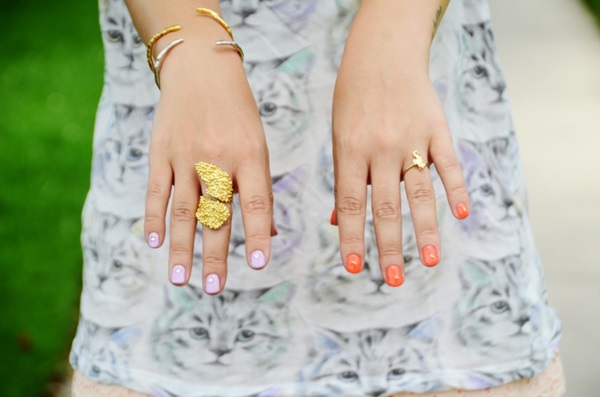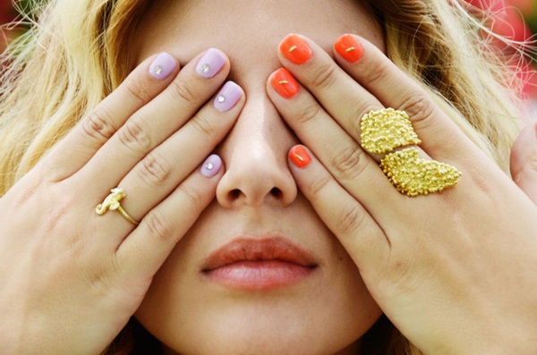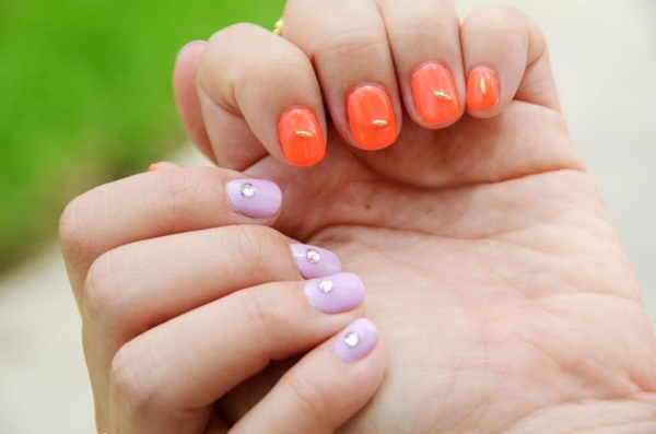 ซึ่งวันนี้เราก็มีแบบตัวอย่างเก๋ๆ มาฝากให้สาวๆ ที่สนใจได้ลองเพ้นท์ตามกันดูด้วย ในเมื่อต้องการฉีกกฎเดิมๆ จะเลือกเพ้นท์เล็บมือคนละสีกันแล้ว ก็เลือกที่มันตัดกันสุดๆ คนละขั้วกันเลยแล้วกัน ข้างหนึ่งเพ้นท์สีส้มสะท้อนแสง นีออนสวยเด่น ตกแต่งด้วยวัสดุ 3Dแต่งเล็บสีทองและทาเคลือบด้วยยาทาเล็บใส อีกข้างก็เพ้นท์สีหวานๆ อย่างม่วงพาสเทล ตกแต่งด้วยเพชรเล็กๆ สำหรับแต่งเล็บ และทาเคลือบน้ำยาทาเล็บใส ออกมาเป็นไอเดียเพ้นท์เล็บ 2 TONE มือละสีที่ดูแล้วเก๋ ชิคไม่เบาเลยทีเดียวเชียวค่ะ เห็นด้วยมั้ยเอ่ย… สาวๆ คนไหนที่เบื่อสไตล์เพ้นท์เล็บแบบเดิมๆ ก็ลองมาเพ้นท์แบบนี้ ข้างละสี กันดูสิคะ รับรองว่าเก๋สุดๆ เลยล่ะ