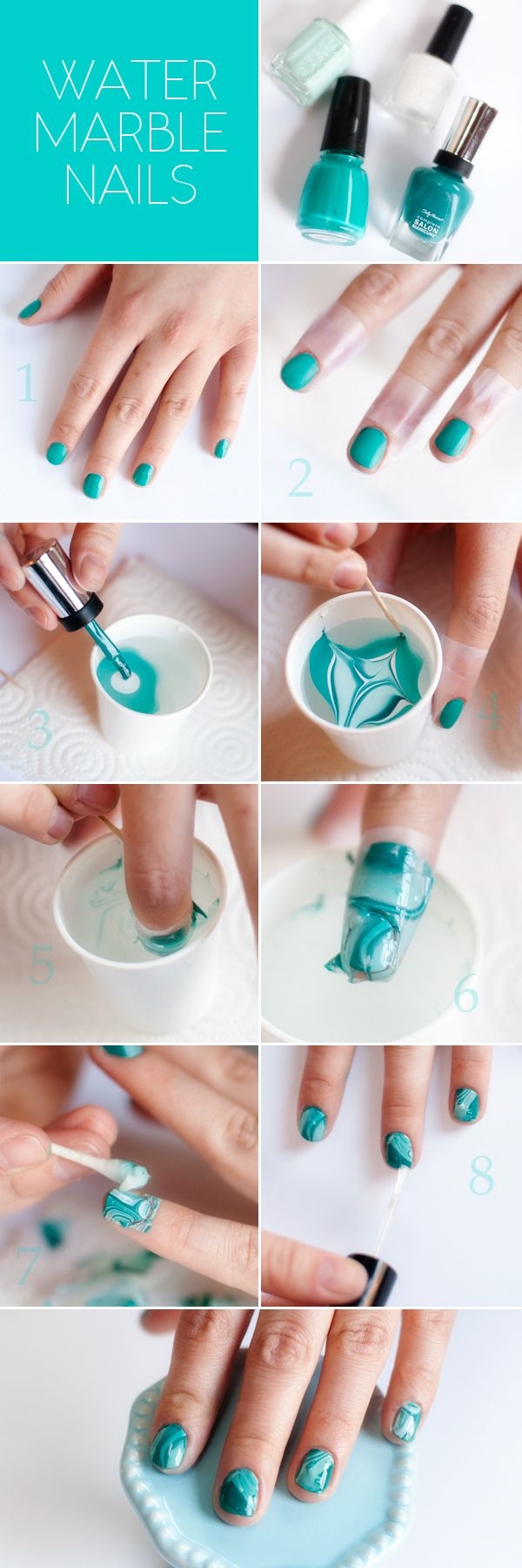 8. แก้ว ถ้วย หรือ ชามพลาสติก เอามาเป็นตัวช่วยในการเพ้นท์เล็บลายหินอ่อนง่ายๆ ด้วยการหยดยาทาเล็บลงน้ำแล้วจุ่มเล็บลงไป
