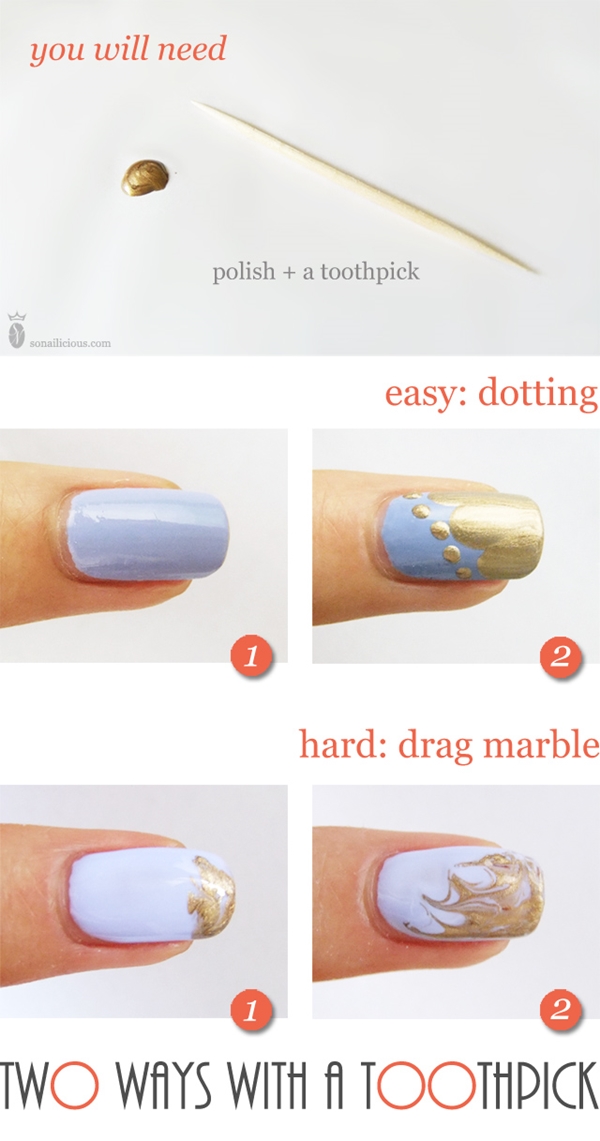9. ไม้จิ้มฟัน ตัวช่วยดีไซน์ลายเล็บสวยๆ ได้หลายสไตล์ ทั้งเพ้นท์ลายจุด ครีเอทลายใหม่อาร์ตๆ หรือ ใช้เป็นตัวช่วยสร้างลายในการทำเล็บลายหินอ่อนร่วมกับแก้ว ถ้วย หรือ ชามพลาสติกในข้อก่อนหน้า