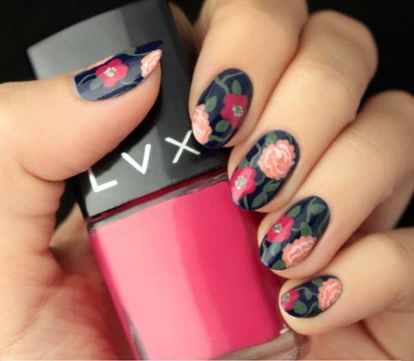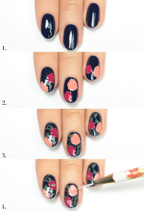 DIY ทำเล็บสวยชิคสไตล์วินเทจกับลายดอกไม้สวยๆ บนพื้นสีน้ำเงิน