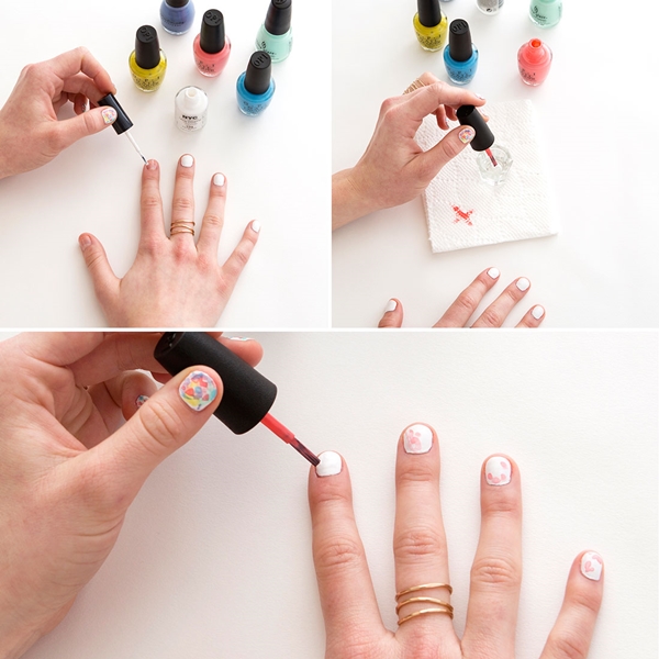 STEP3 เอาพู่กันยาทาเล็บสีชมพูที่เช็ดสีที่กระดาษออกไปเกือบหมดแล้ว จุ่มลงในน้ำยาล้างเล็บที่เทใส่แก้ว จากนั้นก็นำมาเพ้นท์แต้มๆ เป็นจุดๆ ลงบนเล็บสีขาวของเราได้เลย หลังจากทำเสร็จก็จะได้สีชมพูของยาทาเล็บออกมามีลักษณะเหมือนสีที่จางลง เหมือนสีน้ำกันแล้วล่ะค่ะ
