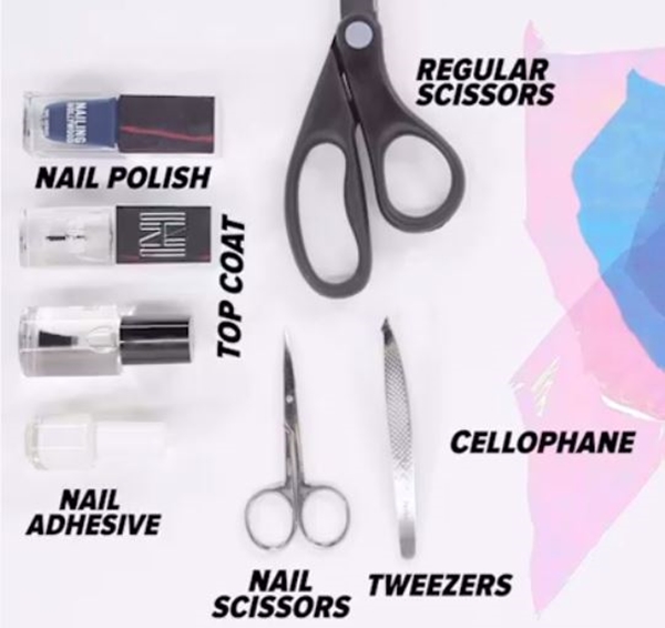STEP 4 ใช้ปากคีบหนีบเอาเศษกระดาษแก้วชิ้นเล็กๆ มาแปะลงไปบนเล็บทีละชิ้น ค่อยๆ เรียงลงบนเล็บ